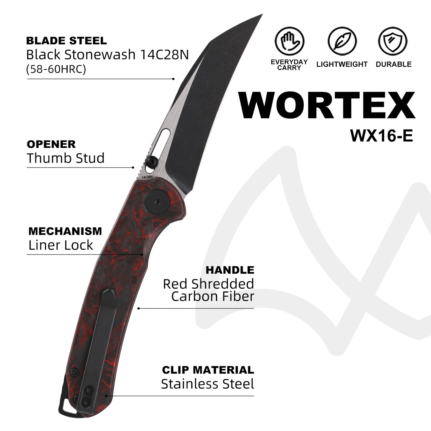 Wortex is one of our compact and lightweight EDC knives. It features 14C28N blade, liner lock mechanism, 4 inch closed size and 2.38oz weight.